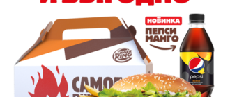 Одно из самых любимых предложений – это «Большое комбо с Чизбургером». По выгодной цене вы можете отведать 2 фирменных Чизбургера, золотистая Кинг Фри, 2 соуса, нежные куриные наггетсы и Pepsi за 359 рублей. Внимание – акция действует только при заказе с доставкой.